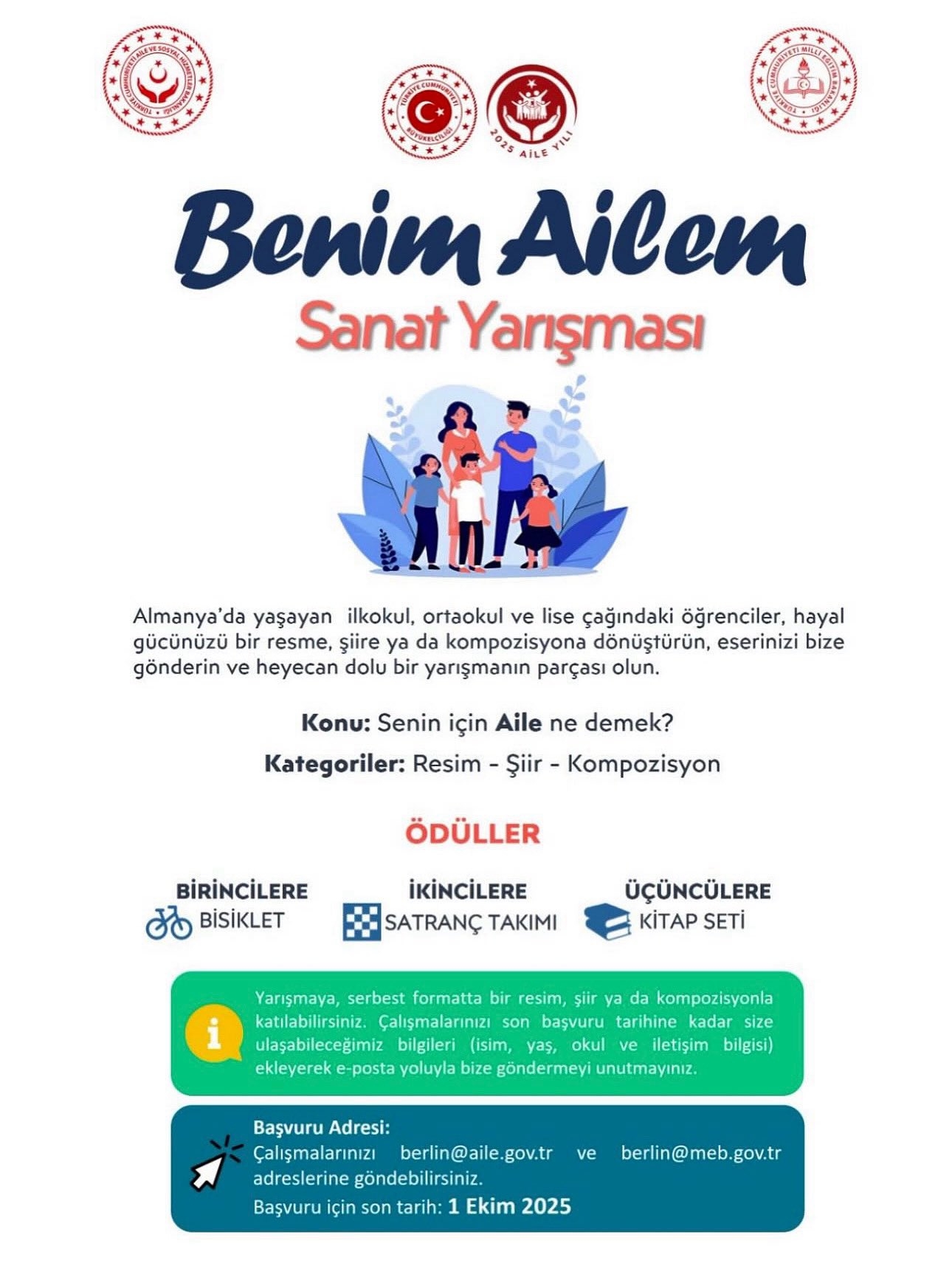Benim Ailem" Sanat Yarışması Başlıyor! Almanya'da yaşayan ilkokul, ortaokul ve lise çağındaki öğrenciler, hayal gücünüzü bir resme, şiire ya da kompozisyona dönüştürün, eserinizi bize gönderin ve heyecan dolu bir yarışmanın parçası olun. Konu: Senin için Aile ne demek? Kategoriler: Resim - Şiir - Kompozisyon Ödüller: Birincilere: Bisiklet / İkincilere: Satranç Takımı / Üçüncülere: Kitap Seti Başvuru adresi: Eserlerinizi berlin@aile.gov.tr ve berlin@meb.gov.tr adreslerine göndebilirsiniz. Son Başvuru Tarihi: 1 Ekim 2025